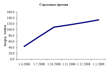 Объем страховых премий, принятых по договорам прямого страхования по состоянию на 1 января 2008 года составил 133,5 млрд. тенге, что на 9,4% меньше аналогичного показателя 2008 года. В том числе объем страховых премий по обязательному страхованию увеличился на 52,3% и составил 30,0 млрд. тенге, по добровольному личному страхованию страховые премии составили 18,9 млрд. тенге (увеличение на 16,7%), по добровольному имущественному страхованию – 84,6 млрд. тенге (уменьшение на 24,1%).