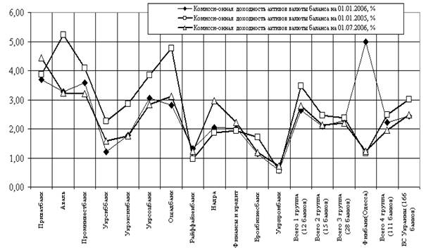 а) Относительный уровень комиссионной доходности валюты баланса в АКБ «Приватбанк» в 2006 году составил 4,45%, относительная доля комисси-онных доходов в операционных доходах составила 38,68%;
