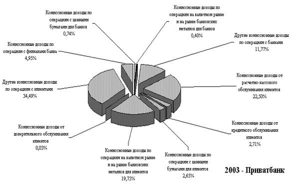 Как оказывает совместный анализ графиков, приведенных на рисунках 2.5 – 2.9 динамика и структура комиссионных доходов АКБ «Приватбанк» в 2003 – 2006 годах характеризуется следующими показателями: