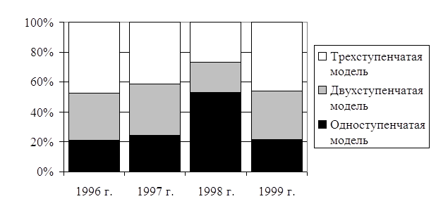 Сравнительный анализ схем позволяет сделать вывод о том, что модель, показанная на рис. 4, является одноступенчатой, при которой заемщик напрямую участвует во всех операциях. Схема, показанная на рис. 5, является двухступенчатой, когда заемщик проходит все процедуры как бы повторно. Схема, представленная на рис. 6, может быть признана трехступенчатой, в которой помимо ипотечных присутствуют также гарантийные процедуры. Экспертная оценка структурного состава схем отечественных кредитов представлена на рис. 7. По данным диаграммы можно заключить, что в настоящее время наиболее распространенной является трехступенчатая модель ипотечного кредитования, вместе с тем, проследить определенную тенденцию в структуре нельзя.