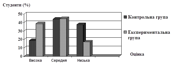 Рис.1 Розподіл оцінок сформованості економічних знань засобами комп’ютерних технологій у студентів контрольної та експериментальної груп