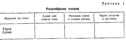Изучение сухих и сочных плодов в VI классе также проводится с помощью метода наблюдения, но при этом рассматриваются макрообъекты. Однако учащимся при рассмотрении данных объектов трудно без помощи учителя выделить существенные признаки плодов. Поэтому учитель руководит наблюдением учащихся с помощью следующего задания: