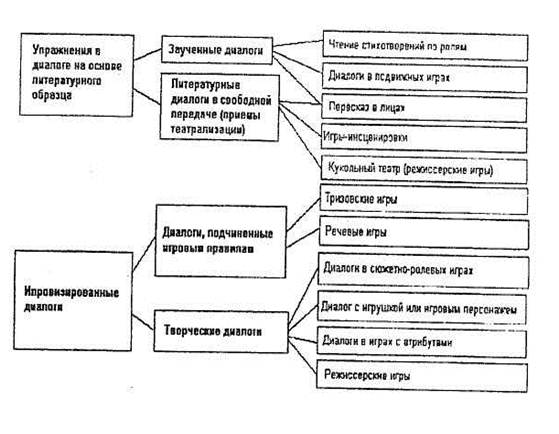Игровые упражнения в диалоге могут быть классифицированы по степени самостоятельности в производстве диалогических высказываний как упражнения на основе литературного текста и упражнения в импровизации самостоятельных диалогов (см. схему). Упражнения в диалоге на основе литературных текстов различаются как заученные литературные диалоги и как литературные диалоги в свободной передаче