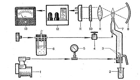 1 — компрессор; 2 — стакан с анализируемым раствором; З — распылитель; 4 — вентиль, регулирующий подачу газа; 5 — манометр; б — промывалка; 7 — горелка; 8— вогнутое зеркало; 9 линза; 10 — светофильтр (монохрома тор); 11—фотоэлемент (фотоумножитель); 12 — усилитель; 13 — стрелочный гальванометр.