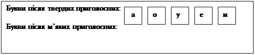 20. Складання таблиці, де узагальнено результати знань учнів про способи позначення м'якості та твердості приголосних буквами. Спочатку учні називають букви, що позначають голосні звуки, які стоять після твердих приголосних (а, о, у, е, и), виставляють їх у заздалегідь підготовлену схему: