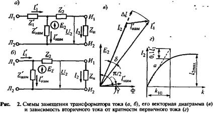 Этому соответствует электрическая схема замещения трансформатора тока. Здесь ко вторичной обмотке приведены также сопротивления первичной обмотки Z\ и ветви намагничивания Z'HaM. Эта схема принципиально не отличается от схемы замещения, например, силового трансформатора. В отличие от него трансформатор тока питается от источника тока. Поэтому первичный ток /, и МДС не зависят от режима работы трансформатора тока.