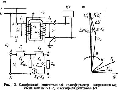 Особенностью измерительного трансформатора напряжения является режим холостого хода его вторичной цепи. Первичная обмотка трансформатора ТУ с числом витков щ включается на напряжение сети М\- Под действием напряжения по обмотке w, проходит ток намагничивания /„щ, создающий в магнитопроводе магнитный поток Ф. Магнитный поток, в свою очередь, наводит в первичной w, и вторичной w2 обмотках ЭДС с действующими значениями соответственно £, = 4,44/w,Ф, Е2 = 4,44/й'2Ф. Отсюда ![]()