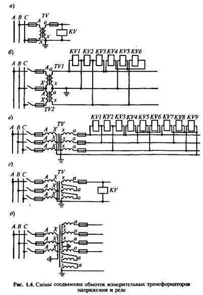 Рассматриваемую схему можно выполнить посредством трех однофазных трансформаторов напряжения или одного трехфазного пятистержневого. Применение трехфазных трехстержневых трансформаторов напряжения в данном случае не допускается в связи с тем, что при замыкании на землю в сети по первичным обмоткам трансформатора через его заземленную нейтраль проходят большие токи намагничивания нулевой последовательности и трансформатор сильно перегревается.