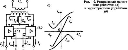 Трансреактор ТИК выполняет функции реактора и трансформатора, преобразующих ток в напряжение. Он состоит из обмотки w{ тока, разомкнутого магнитопровода и вторичной обмотки щ, находящейся в ре-жиме, близком к холостому ходу. Поэтому ток /. Он состоит из двух обычных магнитных усилителей, управляемых общим током /у. Обмотки смещения wm включаются так, что характеристика одного магнитного усилителя АЫ смещается в сторону отрицательных значений /у, а другого AL2 — в сторону положительных значений. При этом в случае /у = 0 наблюдается равенство выходных токов магнитных усилите лей /н1 = /н2.
