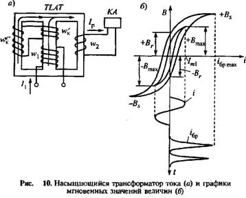 Апериодическая слагающая изменяет режим работы НТТ, она насыщает его магнитопровод. На рис. 10, б показан случай, когда ток /бр из-за апериодической слагающей полностью смещен относительно оси времени. Прохождение такого тока по обмотке w, НТТ сопровождается изменением индукции только в пределах +BS>В> +ВГ.