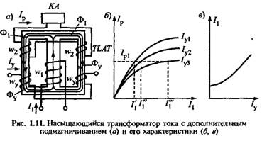 Насыщающийся трансформатор тока TLAT содержит трехстержне-вой ферромагнитный сердечник. Воздействующая величина поступает в первичную обмотку wu а к вторичной w2 подключается измерительное максимальное реле тока КА. Характеристика /р =J{Ii) насыщающегося трансформатора зависит от характера изменения тока /,. Если ток /, синусоидальный, то магнитная индукция в сердечнике изменяется в широких пределах — Bmin<В< +Втях.