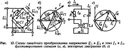 Фазоповоротные схемы. С помощью фазоповоротных схем производят линейные преобразования напряжения в напряжение. При этом напряжение на выходе схемы смещается по фазе относительно напряжения на ее входе на некоторый угол а. В процессе преобразования может измениться и значение величины.