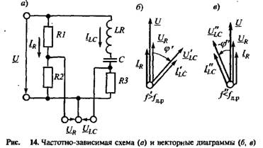 На рис. 14, а показана частотно-зависимая схема, преобразующая изменение частоты в изменения фазы. Ее использовали, например, для выполнения измерительного реле частоты РЧ-1.