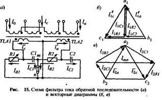 Если на вход фильтра подать только токи обратной последовательности, то этому случаю будет соответствовать векторная диаграмма, показанная на рис. 15, е.
