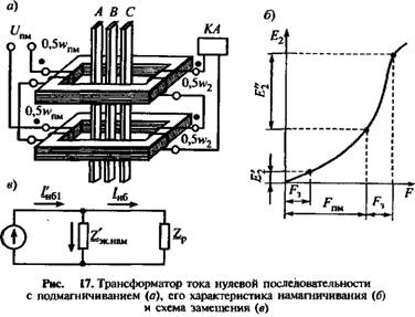 Для повышения чувствительности защиты трансформатор тока нулевой последовательности выполняют с подмагничиванием. Сущность подмагничивания состоит в том, что с помощью дополнительной обмотки в ТНП создается вспомогательный магнитный поток, благодаря которому трансформатор работает в оптимальном режиме, отдавая вс вторичную цепь наибольшую мощность. Первичная обмотка ТНП состоит из одного витка, поэтому магнитодвижущая сила F3, обусловленная первичным током замыкания на землю в сети с изолированной нейтралью, мала. Из характеристики намагничивания ТНП видно. что при отсутствии подмагничивания МДС F3 создает во вторичной обмотке ТНП небольшую ЭДС £2.