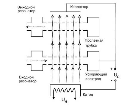 Клистронный усилитель (пролетный клистрон) (Рис.4) используется для генерирования и умножения частоты в диапазоне сантиметровых и дециметровых волн.