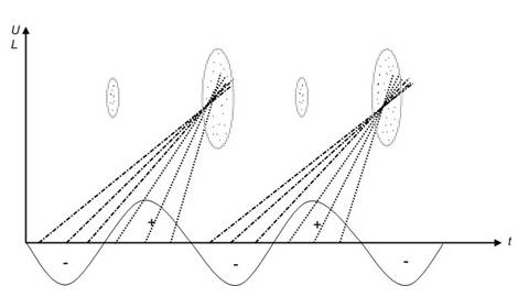 Сгруппированный электронный поток (Рис.3) возвращаясь в резонатор в момент тормозящего полупериода часть своей энергии отдаст полю резонатора, тем самым поддержит колебания в резонаторе. При этом следует помнить, что полупериод поля ускоряющий для электронов идущих от катода, одновременно будет тормозящим для электронов идущих от отражателя.
