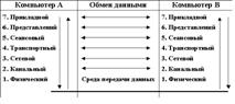 В компьютере В происходит обратный процесс. Физический уровень компьютера В передает полученные данные на канальный уровень, который отделяет заголовок, выполняет предписанные в нем действия и передает оставшиеся данные на сетевой уровень. Сетевой уровень отделяет от полученных данных предназначенный ему заголовок, выполняет необходимые действия и передает оставшиеся данные на верхний уровень и так далее. Прикладной уровень компьютера В передает данные прикладной программе, которой они адресованы.