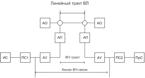 (ИС) – источник сигнала. Преобразователи сигналов (ПС) на передающей и (ПС2) на приемной стороне. Преобразование низкочастотных сигналов в высокочастотные на передающем конце и обратное преобразование на приемном конце осуществляется в аппаратуре ВЧ уплотнения (АУ).