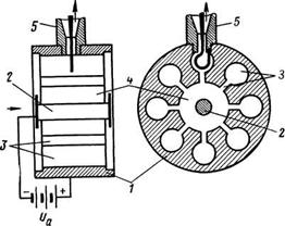 При выборе количества резонаторов N необходимо учитывать следующее. Прежде всего, число N должно быть четным, чтобы обеспечить существование p-вида колебаний. Увеличение числа резонаторов приводит к ухудшению разделения видов колебаний, но одновременно способствует снижению анодного напряжения при заданной индукции В и при неизменном диаметре анода. Обычные магнетроны 10-см диапазона имеют 8—12 резонаторов; в 3-см диапазоне применяются от 12 до 18 резонаторов. При переходе к миллиметровому диапазону число N доходит до 24—38 и более. Несколько особняком стоят коаксиальные магнетроны (см. далее), допускающие использование значительно большего числа резонаторов.