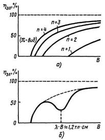 , представленной на рисунке 1.4, а. Однако в случае разнорезонаторных магнетронов в некотором интервале значений магнитной индукции наблюдается "провал" электронного к. п. д., как показано качественно на рисунке 1.4, б. Исследования показали, что в центре "провала" произведение магнитной индукции, выраженной в тесла, на длину волны в сантиметрах имеет для всех магнетронов одинаковую величину, равную приблизительно 1,2 тл.см.