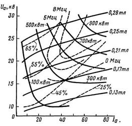 Семейство кривых постоянной генерируемой мощности Рген = const можно получить из следующих соображений. Генерируемая мощность магнетрона, как и всякого электронного прибора, связана с постоянным анодным напряжением, постоянным анодным током и к. п. д. соотношением
