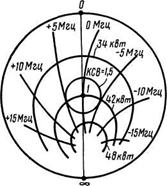 Типичная нагрузочная характеристика импульсного магнетрона 3-см диапазона приведена на рисунке 1.7. Линии постоянной генерируемой мощности близки к окружностям постоянной активной проводимости нагрузки. Линии постоянной частоты имеют веерообразное расположение и близки к линиям постоянной реактивной проводимости на круговой диаграмме полных проводимостей в полярной системе координат.