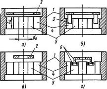 Рисунок. 1.9 - Симметричная механическая настройка магнетрона индуктивным кольцом и индуктивной коронкой (а, б) и емкостнымикольцом и коронкой (в, г):1- анодный блок; 2- металлическое кольцо; 3- металлический стержень; 4 -отверстие резонатора; 5 - щель рез