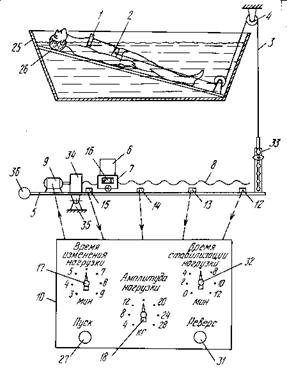 Среди изученных в процессе патентного поиска установок, особое внимание заслуживают те установки, которые имеют в своём составе систему управления нагрузкой.(4) Установка (рисунок 1.5) содержит фиксаторы 1 и пояс 2 пациента, трос 3, направляющие ролики 4, рычаг 5, груз 6, установленный на каретке 7 с реверсивным приводом, и пульт управления 10. Вдоль рычага 5 установлены герконы, на каретке - постоянный магнит 16, а на пульте управления - переключатели времени изменения нагрузки и ее амплитуды. Оба переключателя включены в цепь управления скоростью привода. Груз соответствует максимальной амплитуде нагрузки. В приводе может быть использован двигатель постоянного тока, либо шаговый двигатель. Установка применяется при вертикальном вытяжении в бассейне, либо при горизонтальном вытяжении в ванне, снабженной щитовым ложем. Установка работает следующим образом: Пациент помещается на основание 26 в ванной 25, на нём закрепляется фиксатор 1 и пояс 2. Медсестра устанавливает Параметры процедуры при помощи переключателей на передней панели. После нажатия кнопки «Пуск» начинается процедура. Устройство управления изменяет нагрузку посредством шагового двигателя 9, редуктора 34, винта 8, перемещает каретку 7 с грузом 6 относительно опоры 35 рычага 5. Положение груза оценивается при помощи герконов 15,14,13,12. Система позволяет без применения датчика усилия достаточно точно устанавливать предварительно рассчитанную величину нагрузки.