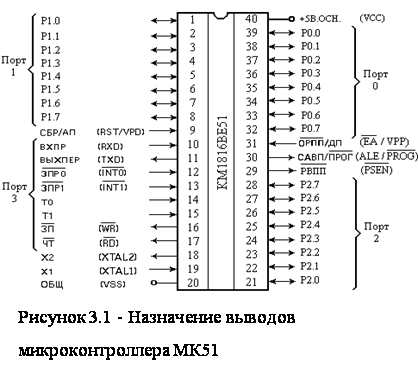 ОМЭВМ, назначение выводов которой представлено на рисунке 3.1 состоит из следующих основных функциональных узлов: блока управления, арифметико-логического устройства, блока таймеров/счетчиков, блока последовательного интерфейса и прерываний, .программного счетчика, памяти данных и памяти программ. Двусторонний обмен информацией между функциональными блоками осуществляется с помощью внутренней 8-разрядной магистрали данных. Разряды порта 3 микроконтроллера имеют двойную функцию, в зависимости от установленных режимов работы. Порт 3 может функционировать как обыкновенный параллельный 8-разрядный интерфейс, либо позволяет организовывать последовательный канал обмена данными и систему прерываний от внешних устройств, причём существует возможность задавать режим работы каждого разряда порта 3 в отдельности.