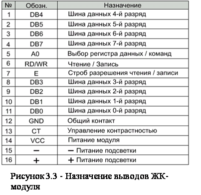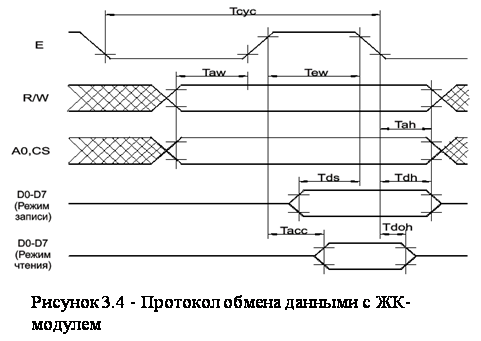 предусилительные схемы, ввиду наличия широкой номенклатуры изготавливаемых сенсоров, в том числе и со встроенными предусилителями сигнала. Схема устройства управления включает в себя систему сбора данных, построенную на одной микросхеме КР572ПВ4. Микросхема имеет 8 аналоговых входов и осуществляет последовательно преобразование по каждому из них. Аналоговый сигнал преобразуется в 8-значное двоичное число. Коэффициент нелинейности не более 0.3% Каждому аналоговому каналу соответствует ячейка оперативной памяти. Считывание данных может происходить асинхронно с получением результатов преобразования. Данный АЦП позволяет «оцифровывать» сигнал с напряжением до 2.5В. На полный цикл преобразования по всем восьми каналам требуется :не более 256 мкс, при тактовой частоте 2.5 Мгц. Ввиду того что в разрабатываемом устройстве нет необходимости в быстроте преобразования, скорость преобразования не имеет особого значения. Тактовым генератором для микросхемы сбора данных является таймер КР1008ВИ1. Для отображения информации применён ЖК-модуль MT-12S2-1 .(LCD) Данное индикаторное устройство позволяет отображать как цифровую так и символьную информацию. Размер экрана 2х12 символов при матрице символа 5х8. ЖК-модуль имеет встроенный контроллер управления экраном, аналогичный SED1520DOA фирмы SEIKO EPSON. Шина данных модуля имеет восемь разрядов. Назначение выводов ЖК-модуля (рисунок 3.3) и протокол обмена данными с ним показаны (рисунок 3.4) будут затронуты подробнее при разработке алгоритма программы.