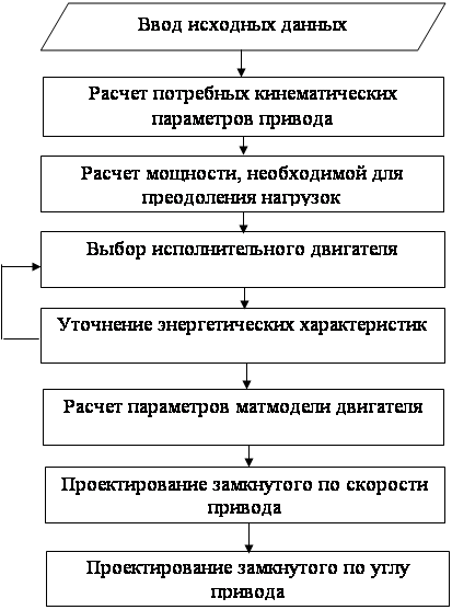 3. Разработка алгоритма проектирования следящего приводаСледящий привод, установленный на подвижном основании обычно замкнут по углу поворота нагрузки. С целью улучшения динамических характеристик он может содержать местную обратную связь по скорости двигателя или скорости нагрузки, компенсирующие связи по управляющему и возмущающему воздействиям. Алгоритм проектирования следящего привода представлен на рисунке 3.1.