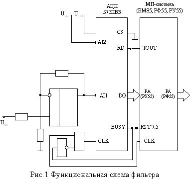 Минимальная конфигурация МП-системы на основе набора К1821, характеристики АЦП (572ПВ3) и технические требования по обеспечению их работы определяют функциональную схему фильтра, приведенную на рис. 1.