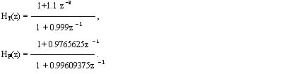 Разностное уравнение задает во временной области порядок получения выходной последовательности отсчетов из входной. В z-плоскости свойства цифрового фильтра описывает передаточная функция H(z), которая при двухкаскадной структуре и для приведенного выше разностного уравнения имеет вид:
