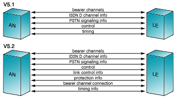 Имеется два типа V5: V5.1 и V5.2. Протокол V5.1 функционирует на одном потоке Е1, тогда как протокол V5.2 функционирует на группе потоков Е1 (до 16). Оба этих протокола могут использовать временные интервалы 15, 16 и 31 для передачи сигналов (конечно, с ограничениями по распределению сигналов по временным интервалам).