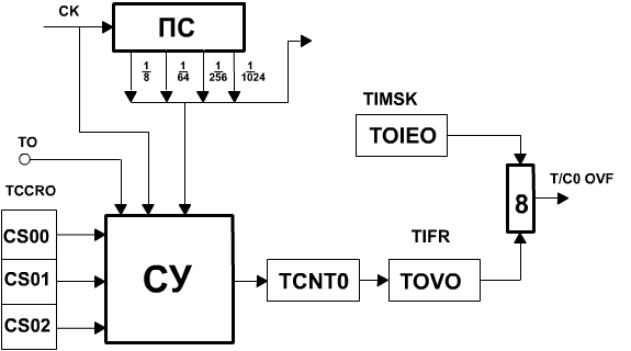 Тактовый сигнал микроконтроллера СК поступает в пересчетную схему (prescaler) ПС, представляющую собой десятиразрядный счетчик, где выполняется деление частоты тактового сигнала на 8, 64, 256 и 1024. Сигналы с четырех выходов пересчетной схемы поступают в схему управления СУ (мультиплексор). При наличии в микроконтроллере таймера/счетчика Т/С1 эти же сигналы поступают в Т/С1.