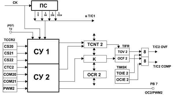 Тактовый сигнал микроконтроллера СК поступает в пересчетную схему ПС, где частота сигнала делится на 8, 64, 256 и 1024. Сигналы с четырех выходов пересчетной схемы поступают в схему управления СУ1 и в таймер/счетчик Т/С1 типа Е. В схему управления СУ1 поступают также тактовый сигнал СК и сигнал из внешнего источника, принимаемый на вход Т2 (вывод порта PD7). При выполнении функции сравнения/PWM вывод порта РВ7 используется в качестве выхода OC2/PWM2 для выдачи сигнала, формируемого при совпадении сравниваемых кодов или сигнала PWM2.