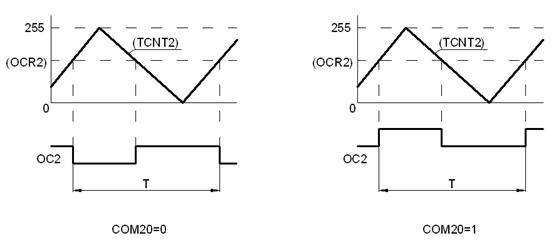 При записи байта в регистр OCR2 (по команде с мнемокодом операции OUT) байт принимается в регистр временного хранения, из регистра которого переписывается в регистр OCR2 при появлении в базовом счетчике кода числа 255. При этом исключается появление в сигнале PWM импульса со случайной длительностью.