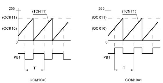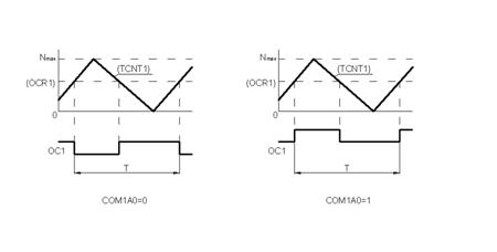Сигнал PWM формируется путем изменения значения сигнала на выходе ОС1 при совпадении кодов в базовом счетчике и регистре OCR1 в процессе счета на сложение и на вычитание. Вид изменения сигнала зависит от состояния разряда СОМ1А0. На рисунке 2.8 изображены графики изменения числа в базовом счетчике (TCNT1) и временные диаграммы сигнала PWM при разных состояниях разряда СОМ1А0.
