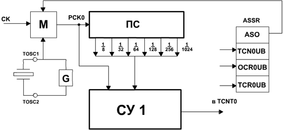 При нулевом состоянии разряда AS0 регистра ASSR используется тактовый сигнал СК, при единичном состоянии – сигнал генератора G (режим реального времени). Выбранный сигнал РСК0 с выхода мультиплексора М поступает в пересчетную схему ПС, в котором выполняется деление частоты на 8, 32, 64, 128, 256 и 1024.
