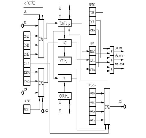 16-разрядный таймер/счетчик может получать тактовый сигнал (CK), CK после предварительного делителя и от внешнего вывода. Кроме того его можно остановить. В регистрах управления TCCR1A и TCCR1B находятся различные флаги, указывающие на переполнение, совпадение при сравнении и случаи захвата событий. В регистре масок прерываний TIMSK (Timer/Counter Interrupt Mask Register) устанавливаются разрешения/запрещения прерываний таймера/счетчика1. При внешнем тактировании таймера/счетчика1 внешний сигнал синхронизируется частотой тактового генератора CPU. Для правильной работы таймера/счетчика по внешнему тактовому сигналу минимальное время между двумя переключениями внешнего тактового сигнала должно быть не менее одного периода тактового сигнала CPU. Синхронизация внешнего тактового сигнала ведется нарастающим фронтом внутреннего тактового сигнала CPU.
