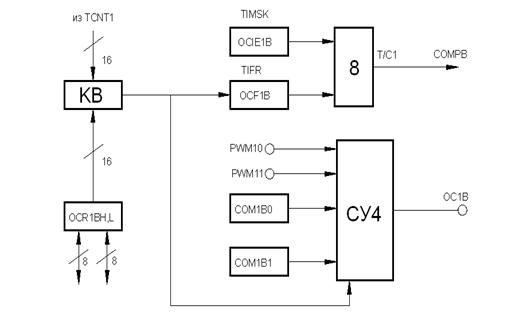 Дополнительными элементами являются компаратор канала В (KB), регистр сравнения OCR1BH, L, два допо