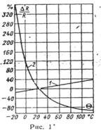 Температурна залежність опору ТСП (рис. 1.2 крива 2) досить добре описується формулою Rθ=AeВ/T, де Т – абсолютна температура, А – коефіцієнт, що має розмірність опору, В - коефіцієнт, що має розмірність температури. На рис.3 для порівняння наведено температурну залежність для мідного терморезистора (пряма 1).