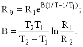 Якщо для використаного перетворювача не відомі коефіцієнти А и В, алі відомі опори R1 й R2 при Т1 і Т2, то опір і коефіцієнт В для будь-якої іншої температури можна визначити зі співвідношень: