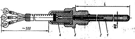 Конструкція термометра опору типу ТОП-6097, призначеного для вимірювання температури газоподібних або рідких хімічно неагресивних й агресивних середовищ у діапазоні від -50 до +250 , показана на рис.1.3. Чутливий елемент 1 платинового термометра являє собою керамічний каркас, у канали якого поміщено спіраль із платинового дроту. Кінці спирали приварені до виводів, через які чутливий елемент з'єднаний із трьохжильним кабелем. Канали каркаса засипані керамічним порошком й герметичні. Захисна арматура 2 термометра являє собою зварну конструкцію зі сталевої сурми й штуцера. Місце сполучення чутливого елемента з кабелем закривається ковпаком 4 із прес-матеріалу АГ-4В, угвинченим у верхню частину штуцера 3, і заливається компаундом.