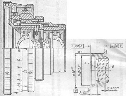 2. Объективы со свинчивающимися справами, линзы и оправы которых изготовляют по калибрам и соединяют между собой с минимально допустимыми зазорами. Оправы с линзами соединяют с корпусом объектива резьбой без дополнительной юстировки.