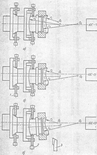 определяют из чертежа линзы. Для линз, у которых поверхность, ближайшая к трубке, выпуклая, центры кривизны совмещают так, как показано на рис. 9, б. В этом случае