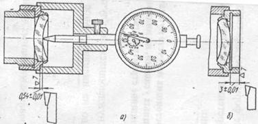 20** протачивают до размера, равного диаметру корпуса объектива, с минимально необходимым зазором (порядка 0,01 мм). Торец оправы подрезают так, чтобы можно было выдержать указанный на чертеже линзы размер 0,54 ± 0,01 мм. Расстояние от линзы до торца при подрезке измеряют индикаторным приспособлением, показанным на рис. 4, а. Затем линзу снимают с центрировочного патрона и устанавливают в цанговый патрон токарного станка на обработанное базовые поверхности. Подрезают второй опорный торец оправы таким образом, чтобы выдержать размер 3±0,01 мм до второй поверхности линзы (см. рис. 4, б). Процесс центрирования линзы окончен.