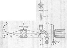 Устройство автоколлимационной трубки ЮС-13. Схема автоколлимационной трубки ЮС-13 приведена на рис. 5. Прозрачное перекрестие па зеркале 8 трубки, подсвеченное осветителем 7, проецируется объективом 2 на плоскость, в которой расположен центр
