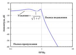 Фильтр Чебышева I рода. Это более часто встречающаяся модификация фильтров Чебышева. В полосе пропускания такого фильтра видны пульсации, амплитуда которых определяется показателем пульсации